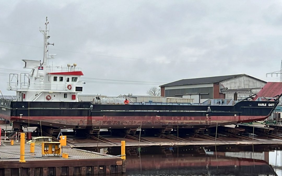 Das Frachtschiff „HARLE GATT“ ist vom 18. November 2024 bis voraussichtlich zum 25. November 2024 auf der Werft. Es werden Reparatur- und Konservierungsarbeiten am Unterwasserschiff sowie oberhalb der Wasserlinie durchgeführt. Auch Komponenten wie die Propeller, die Wellenanlagen, die beiden Hochleistungsruder und die Bugstrahlanlage werden kontrolliert. Zusätzliche sind in diesem Zeitraum verschiedene Besichtigungen durch den BG-Verkehr vorgesehen.