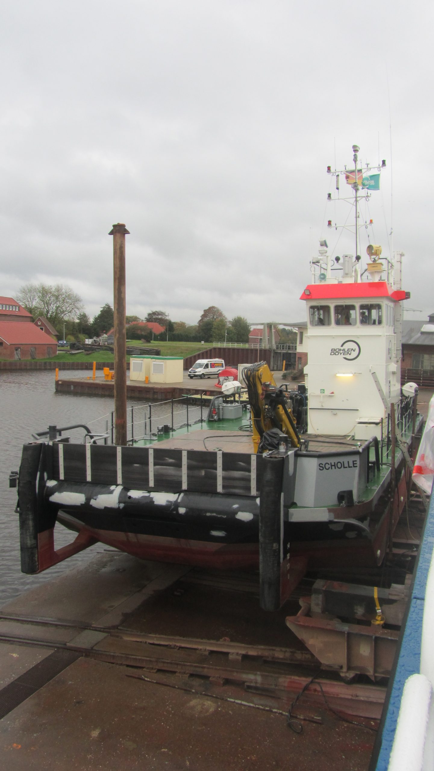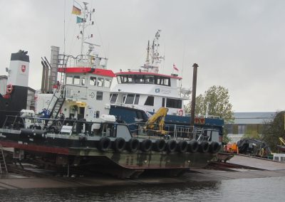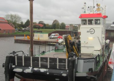 Die MS „SCHOLLE“ der Firma Bohlen & Doyen, Wiesmoor, liegt seit dem 16. Oktober an unserer Werft, um die Konservierungsarbeiten am Unterwasserschiff und im Decksbereich und den Aufbauten durchführen zu lassen. Im Rahmen der Werftliegezeit, voraussichtlich bis Ende Oktober, werden zur verbesserten Stoßdämpfung des Schiffes neue D-Fenderaufnahmen angefertig und angebracht. Die Abnahme erfolgt bei der Besichtigung durch den BV.